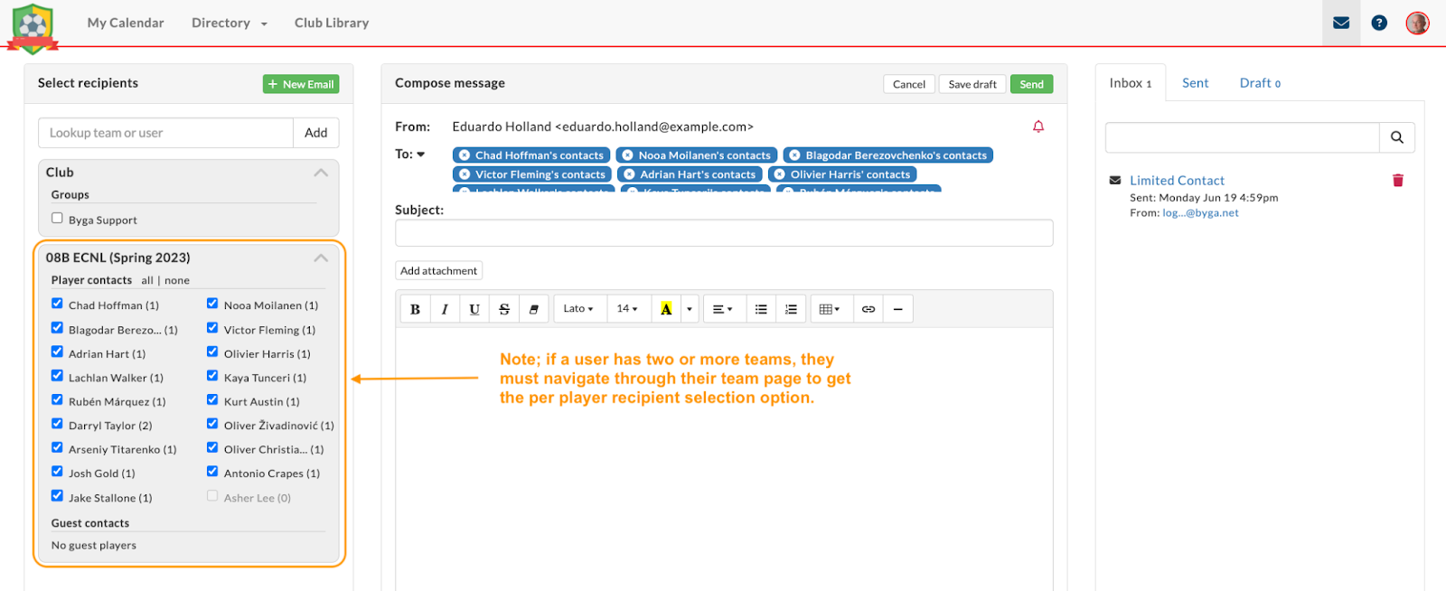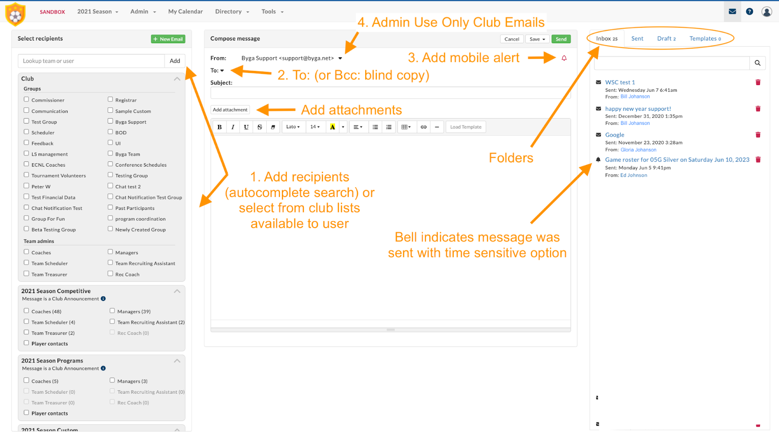 Click on the New Email button to start composing a message. In addition, if users are within various portions of the app (e.g., a team, an event), clicking on the Byga message icon will automatically populate the relevant recipients.